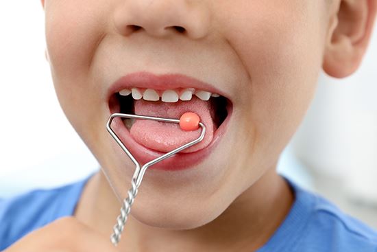 Aufgrund einer Schwäche der Lippen- und Zungenmuskulatur stößt die Zunge beim Schlucken gegen die Frontzähne. Wir unterstützen die kieferorthopädische Behandlung